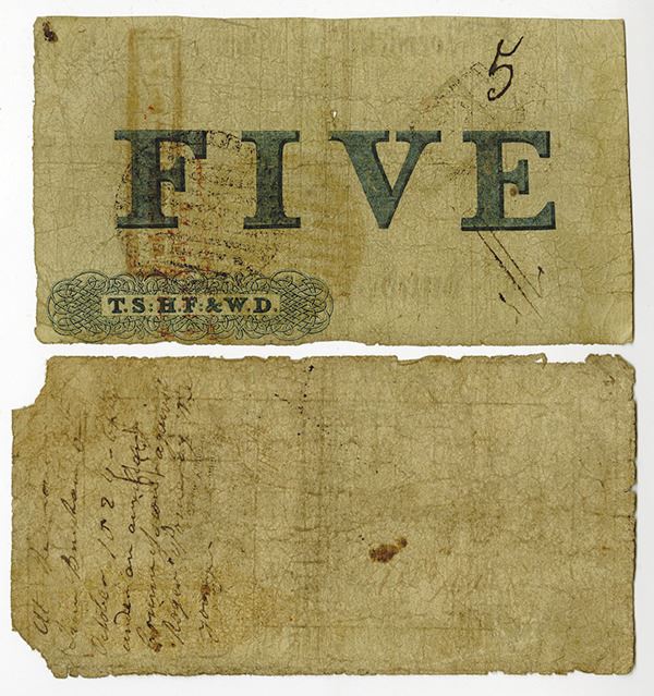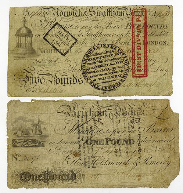 Great Britain, Lot of 2 notes, Includes Brirham Bank, 1818, £1, VG with edge faults and small pieces missing from top right corner; and Norwich & Swaffham Bank, 1822, £5, Choice VG to Fine but margins trimmed close to text and overprints on face from bankruptcy court.