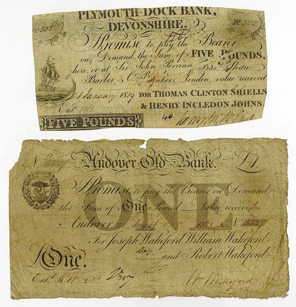 Great Britain, Lot of 2 notes, Includes Andover Old Bank, 1821, £1, VG with edge faults and small piece missing from top left corner; and Plymouth Dock Bank, Devonshire, 1819, £5, Fine but margins trimmed close to text.