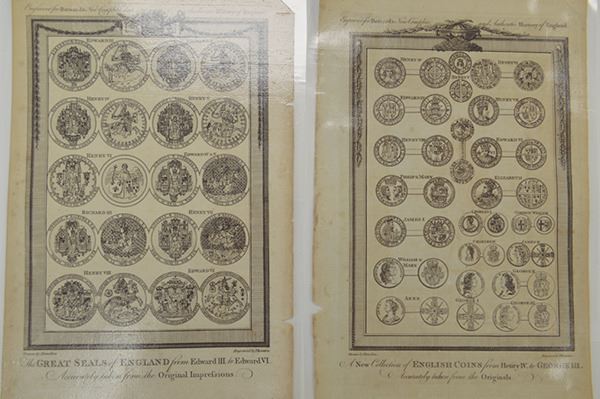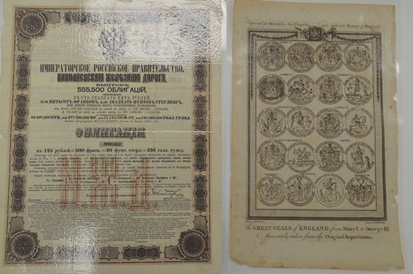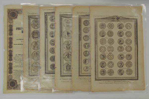 England and Russia. Lot of 7 items, 6 are pages with prints of coins (3) or Great seals (3) of England. Also included is a Russian Bond, Imperial Government of Russis, Nicolas Railroad, 125 Rubles, 1870, All are laminated with thin plastic. Attractive.