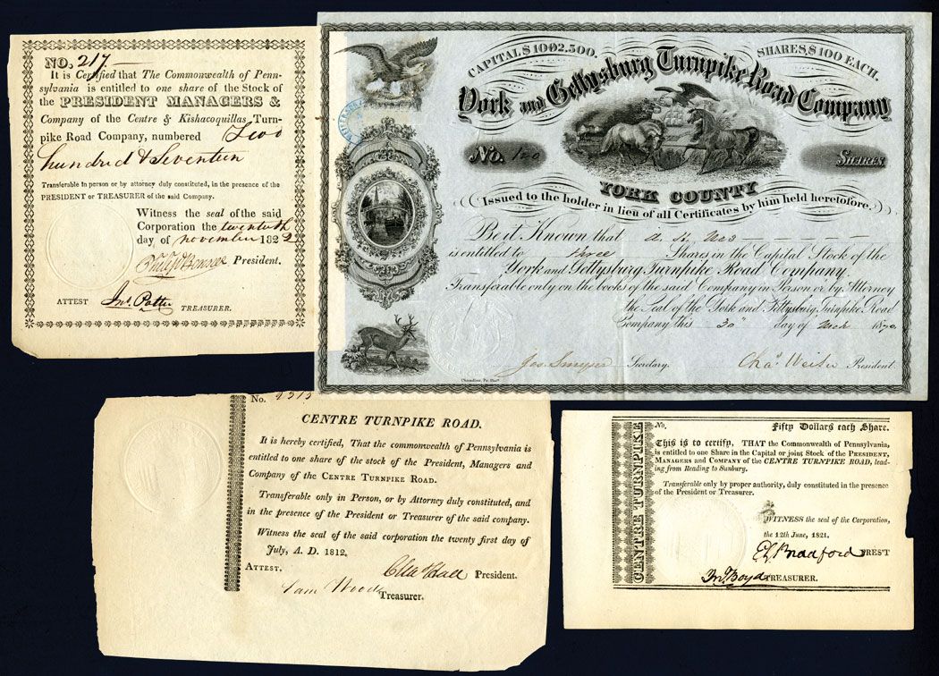 Pennsylvania, Lot of 4 stock certificates, Includes two Centre Turnpike Road stocks, 1812 and also 1821 certificates, 1 Share each; Centre & Kishacoquillas Turnpike Road Co., 1822, 1 Share and York and Gettysburg Turnpike Road Company, 1870, 1 Share, the first 3 on plain or simple forms, the Gettysburg with Pennsylvania Arms, Eagle, Deer and Canal boat on left, All are in Fine to VF condition. Attractive turnpike quartet.