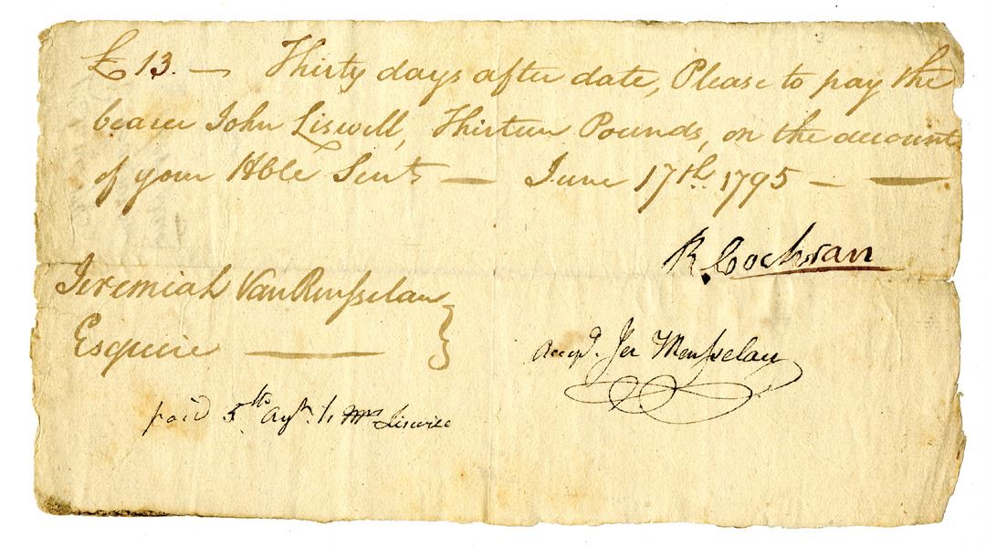 New York, 1795. Note to pay £13 30 days after date on letter, June 17th, 1795. Possible signatures are Jeremiah Van Rensselaer & Captain Robert Cochran. Jeremiah Van Rensselaer (August 27, 1738 _ February 19, 1810), from the prominent Van Rensselaer family, was Lieutenant Governor of New York and a member of Congress in the U.S. House of Representatives, representing New York in the 1st United States Congress. Robert Cochran (1735_1824), a Boston native, was harbor master of Charleston S.C. during the Revolutionary War. Letter is in VF condition.
