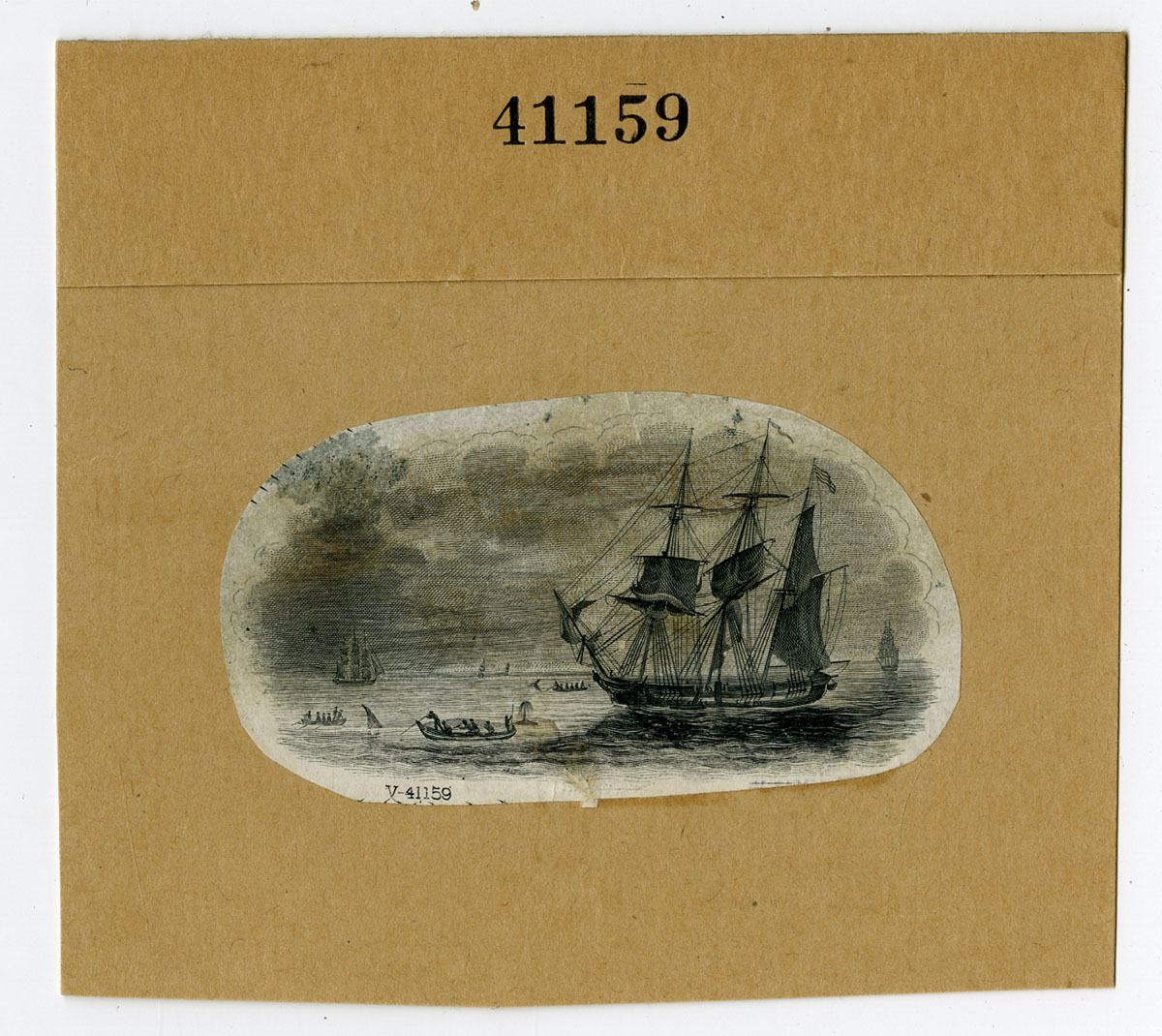 1830-1840's. Proof. 4 by 3.5 inch whaling vignette by TC&Co. Black intaglio print, "V-41159" imprints, Very small whaling scene. Printed on india paper and mounted on manila card. Unique in archive. VF condition., TCC. This vignette was used on U.S. Obsolete banknotes. From the ABNC Archives and printed by an TC&C, an ABNC Predecessor company.