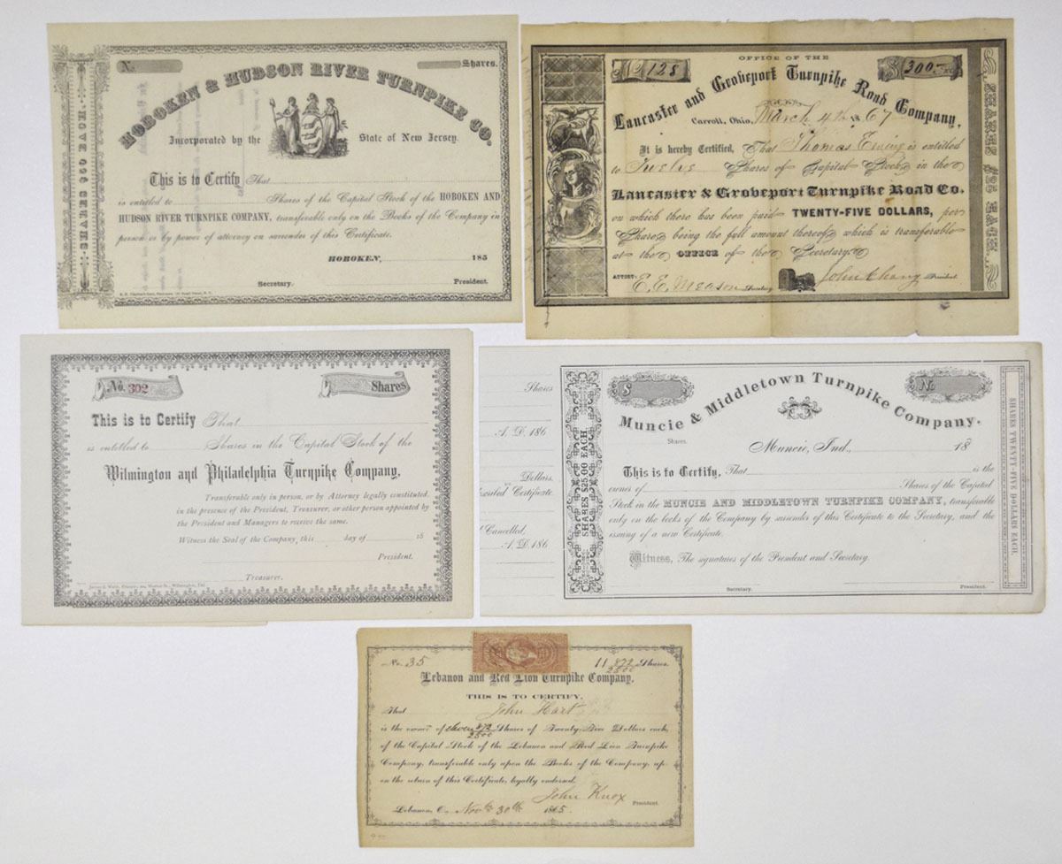 Various States, ND (1850s)-1867. Lot of 5 certificates, 2 Issued and 3 remainder Turnpike Stock Certificates representing early road companies, each with ornate engraved borders, period script, and manuscript entries. Includes examples from U/U, Hoboken & Hudson River Turnpike Co. (NJ); 1867, I/U, Lancaster & Groveport Turnpike Road Co. (OH); U/U, Wilmington & Philadelphia Turnpike Co.; U/U, Muncie & Middletown Turnpike Co. (IN); and, Lebanon, OH. I/U Lebanon and Red Lion Turnpike Co. . Attractive early transportation-related certificates with detailed typography. Conditions range from VF to XF, with light handling, toning on select pieces, and manuscript entries. (5)