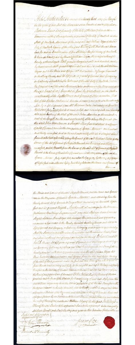 New York, NY, March 23, 1785. 2 Page deed with attached outer page, 9 by 15 inches with indented top. The deed is for a certain "MessuagoTenement or dwelling House" and additional property bounded by a 48 foot frontage on Wall Street deeded from Isaac Cox to William Edgar. Isaac Cox was born in Bermuda and his family was one of the founding families of Bermuda. He was justice of the Peace of Nassau, Bahamas; moved to Philadelphia in 1761 and became paymaster for the troops, a member of the Common council of Philadelphia in 1774, signed the memorial to the Continental Congress on November 18th, 1776 and was owner of 3 American privateers. William Edgar, a merchant at 7 Wall street in 1789 engaged in the Fur trade with China and East india. He served on the Board of directors to the Bank of New York; was treasurer for the first insurance company in the U.S. "Mutual"; and, served on the council of the St. Patrick's society of New York. The deed is signed by Isaac Cox, John Ramsey (Cox's brother in law) and Daniel McCormick (who also served on the first board of the Bank of New York). The property mentioned in this deed very possibly sits where the first bank of New York building was built. Historic and very early Wall Street document. VF condition with folds.