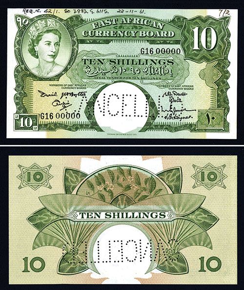 East Africa, ND 1961, 10 Shillings, P-42a Unlisted Archival Specimen, Queen Elizabeth II on top left, Green on light green underprint, Pin-punch “Cancelled”, S/N G16 00000, Archival pen notations on top margin including date 22-11-61, Appears in Uncirculated to CU with evidence of previous mounting on right side back margin. TDLR
