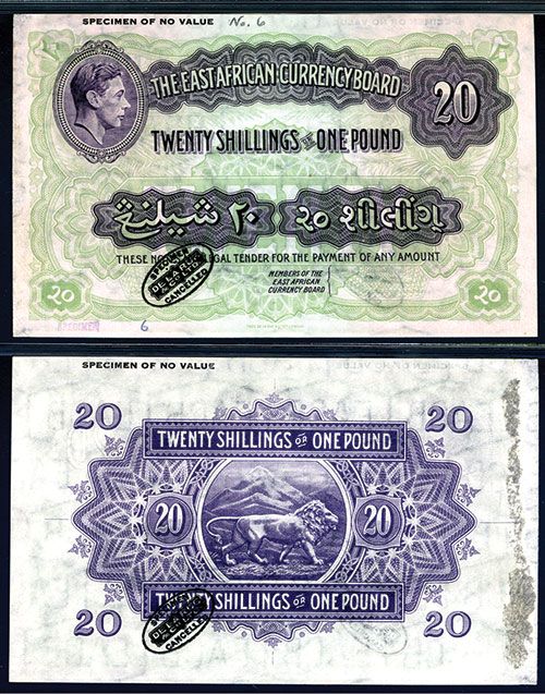 East Africa, ND 1938-52, 20 Shillings = £1, P-30cts unlisted Color Trial banknote, purple on lime green instead of issued black-blue on yellow-orange, no signatures, Oval TDLR specimen overprints on front and back with small purple specimen overprints on and “No.6” on top and bottom margins, PMG graded About Uncirculated 55 NET with notation of previous mounting, Rare as color trial, TDLR.`