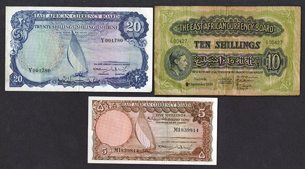 East Africa. 10, 20 Shillings. P-29b 1.9.1950. George VI at left end. Fine, stain. P-45, 47a. EF and Choice Very Fine. 3 pieces.