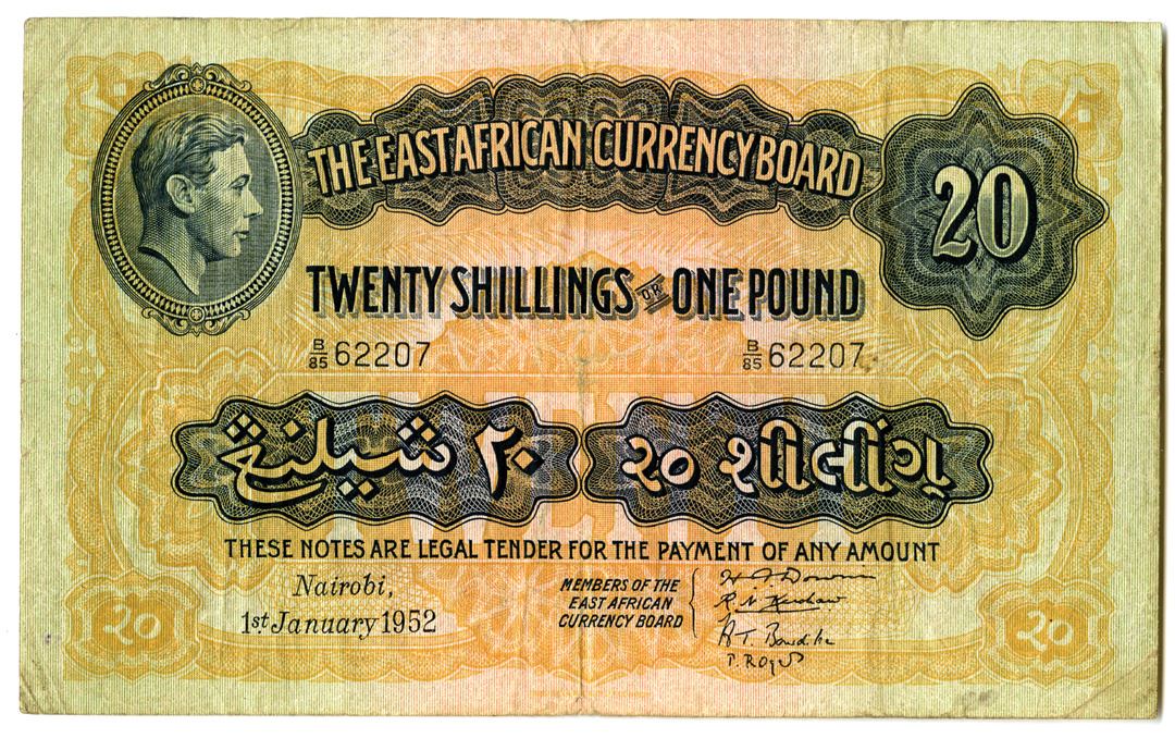 East Africa/British Administration. 1952. 20 Shillings = 1 Pound, P-30b, Issued banknote, Blue-black on yellow and orange underprint, S/N B/85 62207. Printer: TDLR. Fine condition.