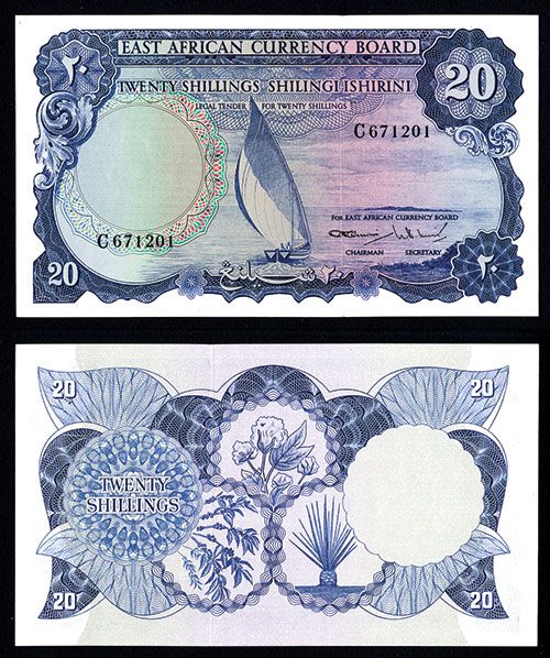 East Africa, ND (1964), 20 Shillings, P-47, Blue on m/c, sailboat at center, back blue, S/N C 671201, Uncirculated to CU with sharp corners and excellent paper quality. Scarcest denomination in high grade.