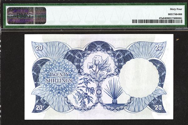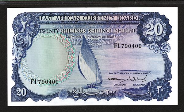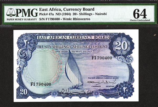 East Africa. 20 Shillings. P-47a. Sailboat at center. PMG graded Choice Uncirculated 64.