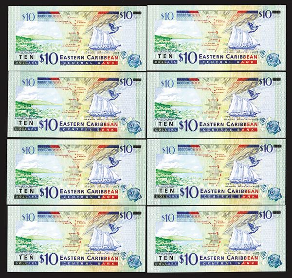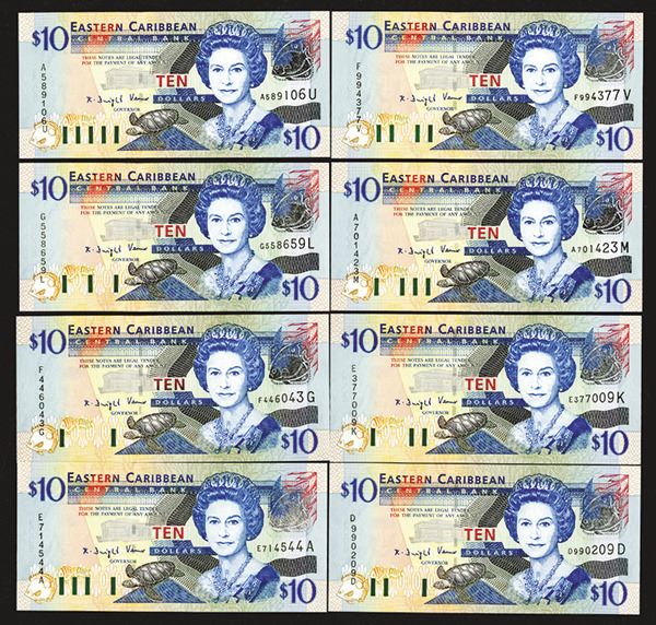 East Caribbean States. $10. P-43a, d, g, k, l, m, u, v. Full set of eight island suffix letters. Elizabeth II at right. All Very Choice Uncirculated. 8 pieces. (Arthur C. Matz Collection).
