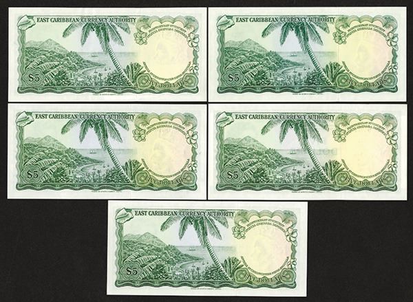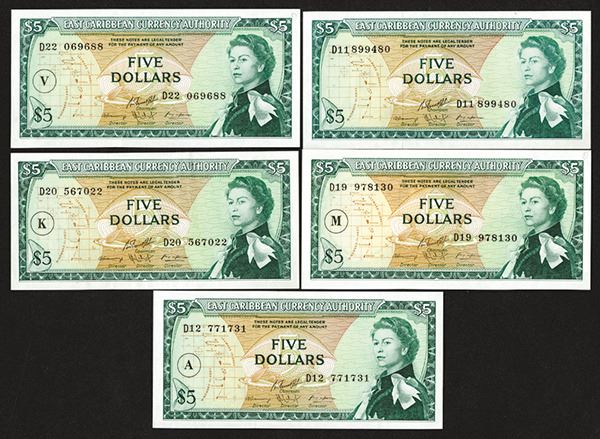 East Caribbean States. 5 Dollars. Includes P-14i, l, n, p, plus a Type III variety (g or h). Elizabeth II at right, island map at left. All Choice to Gem Uncirculated and crisp, one or two with pencil notation in margin. 5 pieces.
