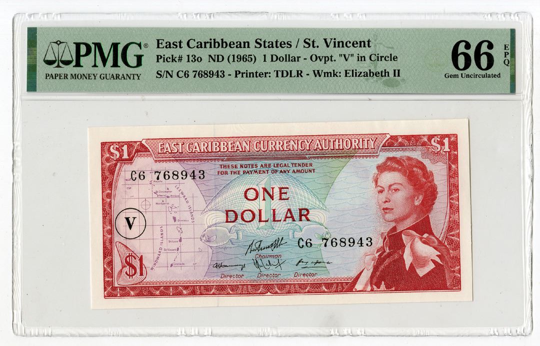 East Caribbean States/St. Vincent, ND (1965). 1 Dollar, P-13o, Issued Banknote, Red on m/c underprint with Queen Elizabeth II at right and map of Islands at left, Back is red on m/c with palm trees and beach, S/N C6 768943, PMG graded Gem Uncirculated 66 EPQ, TDLR.