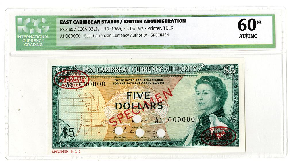 East Caribbean Territories. Specimen 5 Dollars, ND (1965), P-14as ECCA B2a1s. ICG AU/UNC 60* with comment "Glue Residue from Mounting on Reverse". TDLR.