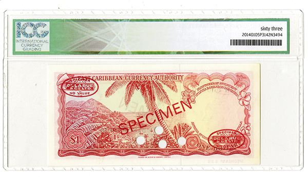 East Caribbean Territories. Specimen 1 Dollar, ND (1968), P-13cs ECCA B1b4s. ICG Uncirculated 63. TDLR.