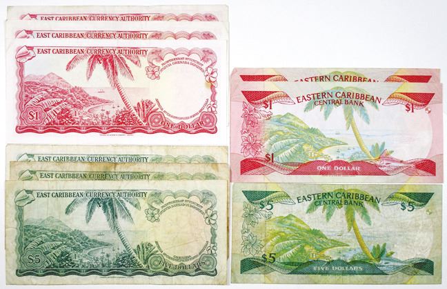 East Caribbean StatesÉ Group of issued notes Includes, East Caribbean Currency Authority $1, ND (1965), P-13a (1) P-13f (1) P-13h (1), TDLR; $5, ND(1965); P-14e (1) P-14l (2), TDLR; Eastern Caribbean Central Bank $1, ND(1985-88), P-17g (1) P-17k, TDRL; $5, ND (1986-88), P-18l. Notes range from Fine-VF condition (9)(Sold "AS IS" No returns accepted)