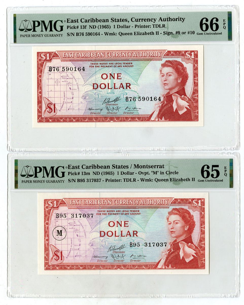 East Caribbean States/St. Lucia, ND (1965). Lot of 2 Issued Banknotes, Includes: 1 Dollar, P-13f & P-13m, Issued Pair of Banknotes, Red on m/c underprint with portrait of Queen Elizabeth II in uniform at right, Back is red on m/c with beach, S/Ns B76 590164 & S/N B95 317037, Both notes are PMG graded: First is Gem Unc 65 EPQ and other is Gem Unc 66 EPQ, TDLR. (2). Sold "AS IS" no returns accepted.