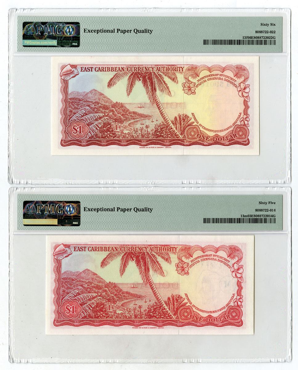 East Caribbean States/St. Lucia, ND (1965). Lot of 2 Issued Banknotes, Includes: 1 Dollar, P-13f & P-13m, Issued Pair of Banknotes, Red on m/c underprint with portrait of Queen Elizabeth II in uniform at right, Back is red on m/c with beach, S/Ns B76 590164 & S/N B95 317037, Both notes are PMG graded: First is Gem Unc 65 EPQ and other is Gem Unc 66 EPQ, TDLR. (2). Sold "AS IS" no returns accepted.