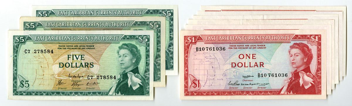 East Caribbean States..., ND (1965). Lot of 9 Issued Banknotes, Includes: 1 Dollar, P-13 (6), Red on m/c underprint; 5 Dollars, P-14 (3), Green on m/c underprint. All notes have a young portrait of Queen Elizabeth II at right and are in UNC to Gem UNC condition. TDLR. (9). Sold "AS IS" no returns accepted.