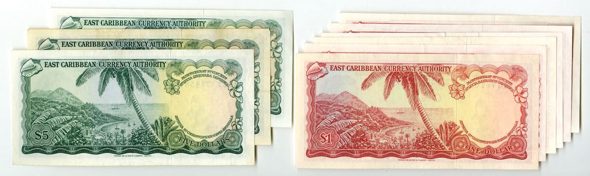 East Caribbean States..., ND (1965). Lot of 9 Issued Banknotes, Includes: 1 Dollar, P-13 (6), Red on m/c underprint; 5 Dollars, P-14 (3), Green on m/c underprint. All notes have a young portrait of Queen Elizabeth II at right and are in UNC to Gem UNC condition. TDLR. (9). Sold "AS IS" no returns accepted.