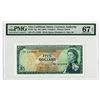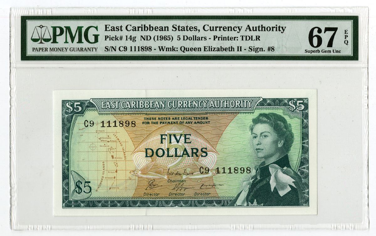 East Caribbean States, ND (1965). 5 Dollars, P-14g, Issued Banknote, Green on brown and m/c underprint, Portrait of Queen Elizabeth II at right and Map of island chains at left, Back is green and m/c, S/N C9 111898, PMG graded Superb Gem Uncirculated 67 EPQ, TDLR.