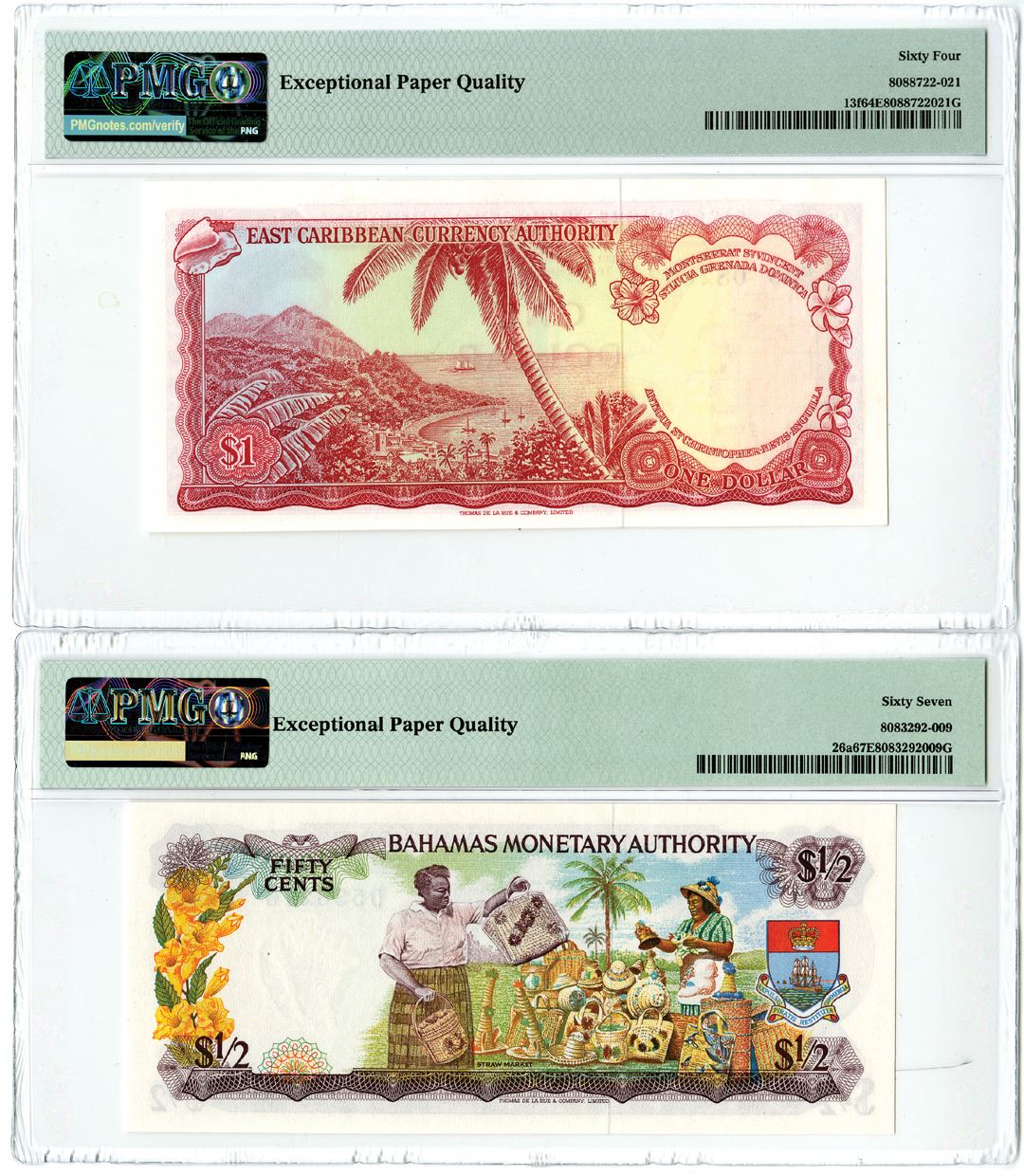 2 Issued banknotes: East Caribbean Currency Authority, 1 Dollar, P-13f, Red on multicolor underprint, S/N B63 082652, PMG graded Choice Uncirculated 64 EPQ; and Bahamas Monetary Authority, 1/2 Dollar, P-26a, Purple on multicolor underprint, S/N D536276, PMG graded Superb Gem Uncirculated 67 EPQ. (2)