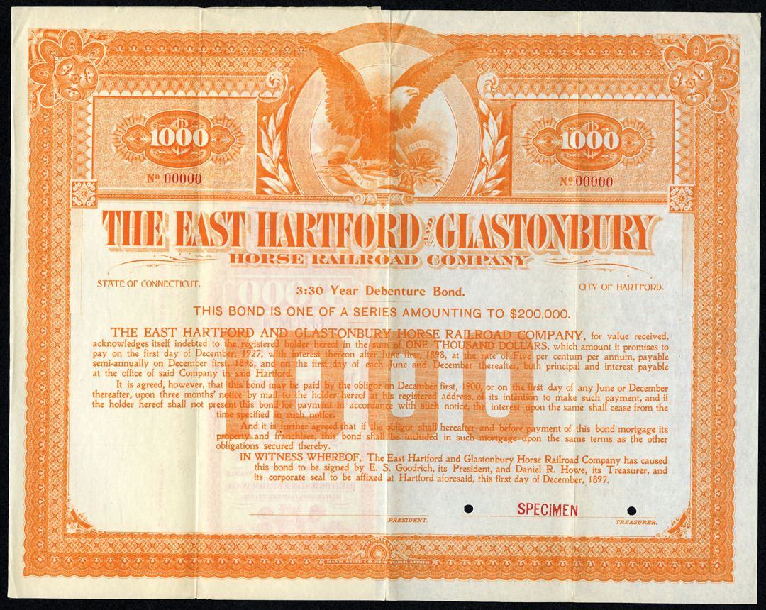 Connecticut, 1897. $1000 Specimen 5% Debenture Bond, Orange text with orange border and underprint, Eagle at top center in circular frame. Red specimen overprints, 00000 serial numbers, and POCs. Fine-VF condition, ABNC.