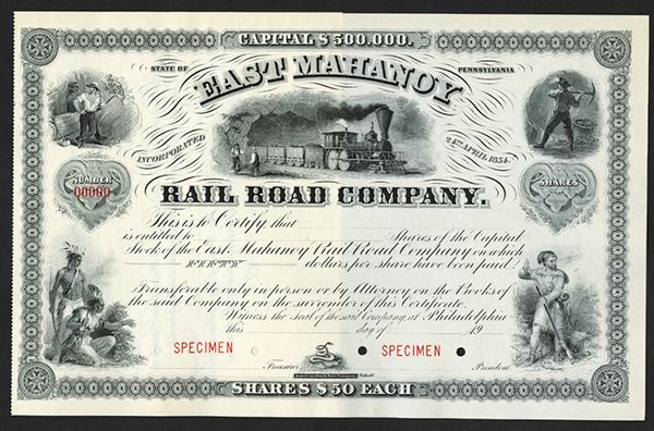 Pennsylvania. Unlisted Shares Specimen Stock Certificate. Vignette of locomotive at center with multiple figures along edge of certificate, including Native Americans at lower left hand corner. Specimen overprints, POC's, VF, ABNC.
