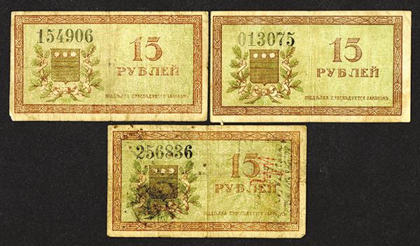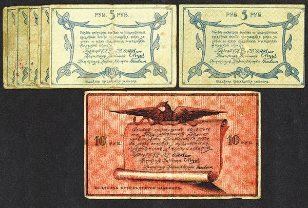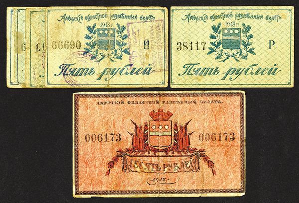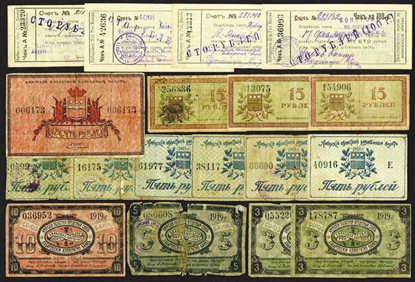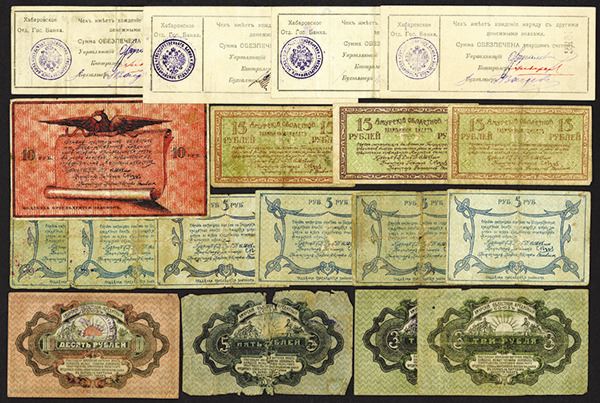 Russia, Lot of 18 notes, Includes 1918 Armur Region Executive Council Issues, 5 Rubles (6), P-S1216; 10 Rubles (1), P-S1217; 15 Rubles, P-S1218 (3); 1919 Habarovsk Issues, 3 Rubles (2), 5 Rubles and 10 Rubles, P-S1224B, 1224C, 1224D; and 1918 Government Bank, Habarovsk Issues (4) all are 100 Rubles in various hand stamp varieties, Similar to P-S1225N or P-S1225W with large and small variety denomination size on the upper right. Condition varies between VG with small issues to XF-AU, mostly Fine. Scarce assortment.