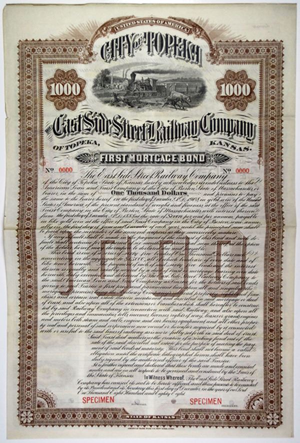 Topeka, Kansas. $1000 Specimen 7% First Mortgage Coupon Bond, Black text with brown border and underprint, Illustration of a train passing by running cows at top. Red specimen overprints, "0000" serial numbers, and POC'S, Fine condition with splitting along left margin, ABNC, Rare specimen in Cox with only 2 found in the ABN Archives in 2002.