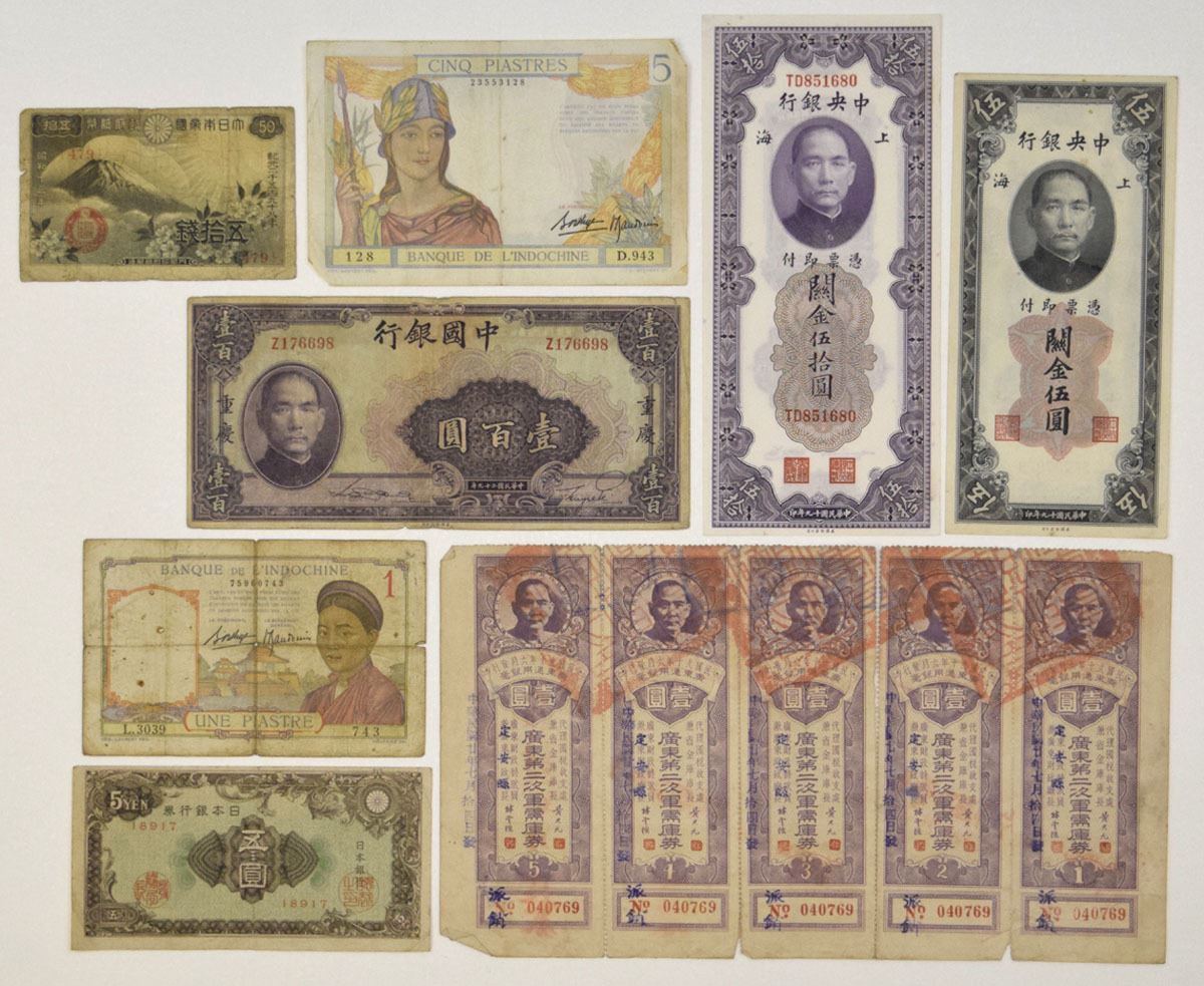 China, Japan and French Indo-China, 1930-ND (1946). Lot of 8 Issued Banknotes, Includes: Bank of China, 1940, 1- Yuan, P-88b S/M#C294-244a, ABNC; Central Bank of China, 1930, 5 Customs Gold Units, P-326, ABNC; 1930, 50 Customs Gold Units, P-329, ABNC; Banque de l'Indo-Chine, ND (1936), 1 Piastre, P-54b; ND (1936), 5 Piastres, P-55b; Great Imperial Japanese Government, 1938, 50 Sen, P-58a; Bank of Japan, ND (1946), 5 Yen, P-86a; Lot also includes Guangdong 2nd Munitions Uncut Sheet of 5 Treasury Notes, Taiwan Circulating Bond. Notes range from Fine to XF condition. (8). Sold "AS IS" no returns accepted.