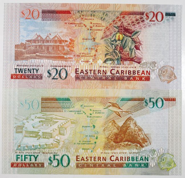 East Caribbean StatesÉ Pair of Issued notes includes $20, ND (2012), P-53a, Purple and slate blue on m/c underprint, Queen Elizabeth II at center right, turtle on lower center, tactile markings at lower left, back shows Government House in Monserrat at left nutmeg in Grenada at right, DLR; $50, ND (2012), P-54b, Bronze and orange on m/c underprint, Queen Elizabeth II at center right, turtle on lower center, tactile markings at lower left, back shows Brimstone Hill in St. Kitts at left, DLR. Notes range from Unc. to CU condition.