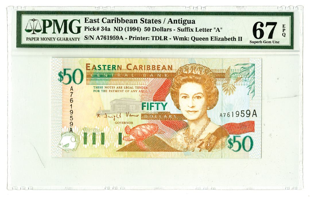 East Caribbean States/Antigua, ND (1994). $50, P-34a, Issued Banknote, Tan, red-orange, and green on m/c underprint, Queen Elizabeth II at right with turtle at center and green throated carib at left, S/N A761959A Printer: TDLR, PMG graded Superb Gem Uncirculated 67 EPQ. Tied with one other note as highest graded in the PMG census out of 10 graded.