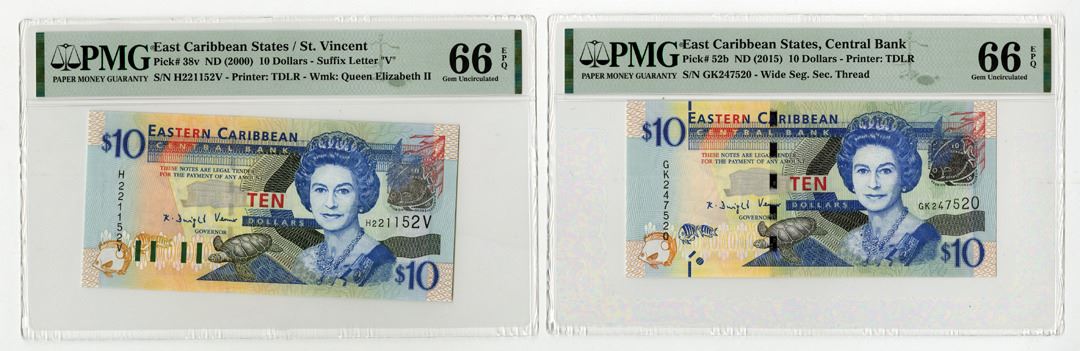 East Caribbean States/St. Vincent, ND (2000-15). Lot of 2 banknotes, Includes: Eastern Caribbean Central Bank $10, P-38v & P-52b, Issued Banknotes. Both are blue and black on m/c underprint with Queen Elizabeth II at center right. S/Ns H221152V & GK247520 Printer: TDLR. Both notes are PMG graded Gem Uncirculated 66 EPQ. (2).