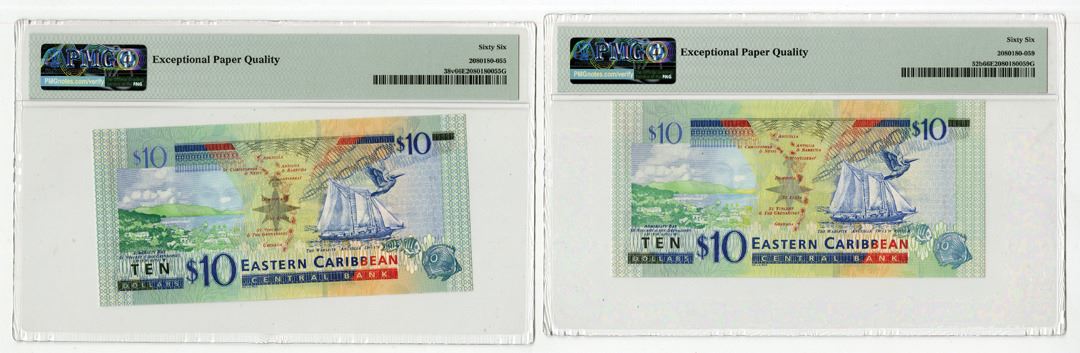 East Caribbean States/St. Vincent, ND (2000-15). Lot of 2 banknotes, Includes: Eastern Caribbean Central Bank $10, P-38v & P-52b, Issued Banknotes. Both are blue and black on m/c underprint with Queen Elizabeth II at center right. S/Ns H221152V & GK247520 Printer: TDLR. Both notes are PMG graded Gem Uncirculated 66 EPQ. (2).
