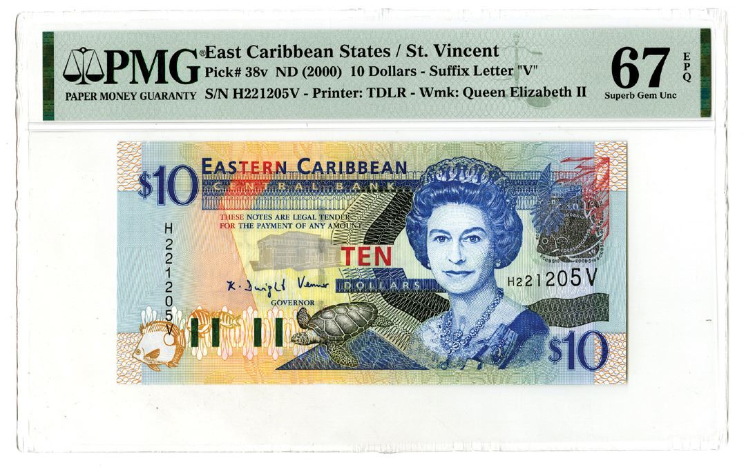 East Caribbean States/St. Vincent, ND (2000). Eastern Caribbean Central Bank $10, P-38v, Issued Banknote. Blue and black on m/c underprint with portrait of Queen Elizabeth II at right. S/N H221205V. PMG graded Superb Gem Uncirculated 67 EPQ.