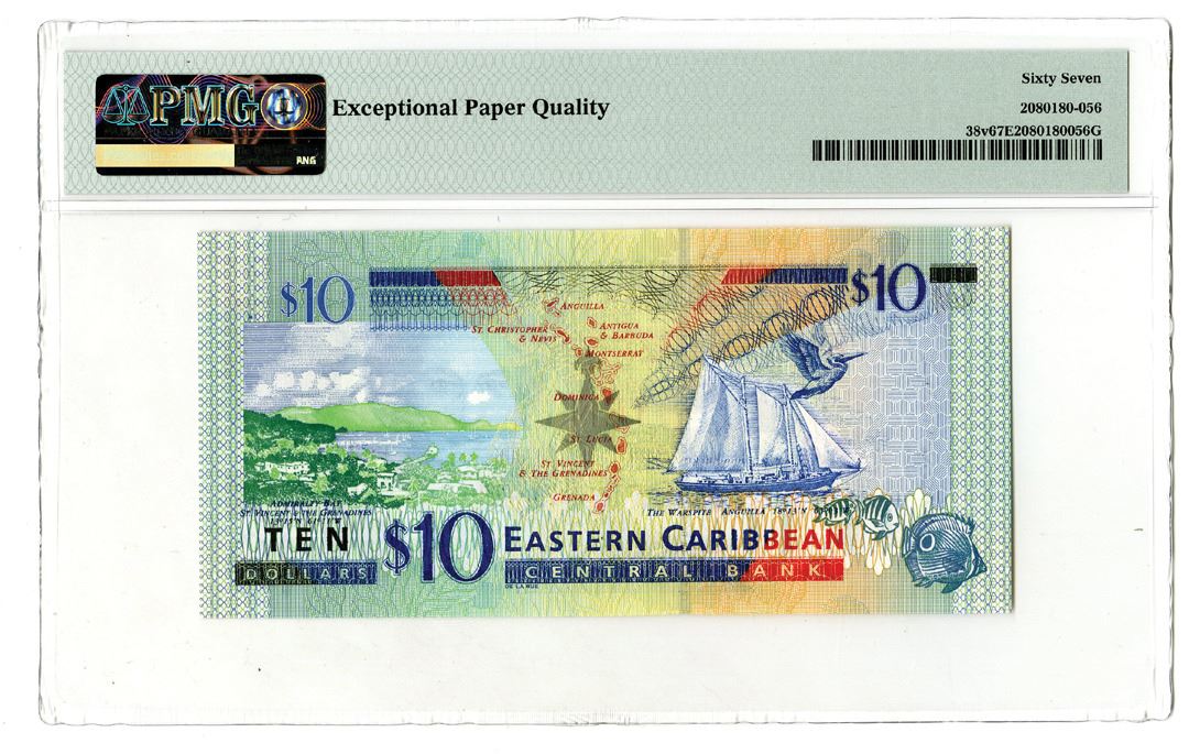 East Caribbean States/St. Vincent, ND (2000). Eastern Caribbean Central Bank $10, P-38v, Issued Banknote. Blue and black on m/c underprint with portrait of Queen Elizabeth II at right. S/N H221205V. PMG graded Superb Gem Uncirculated 67 EPQ.