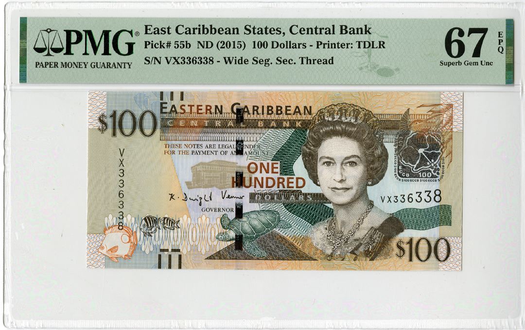 East Caribbean States, ND (2015). $100, P-55b, Issued Banknote, Black, brown and dark green on m/c underprint with the late Queen Elizabeth at right, S/N VX336338, PMG graded Superb Gem Uncirculated 67 EPQ
