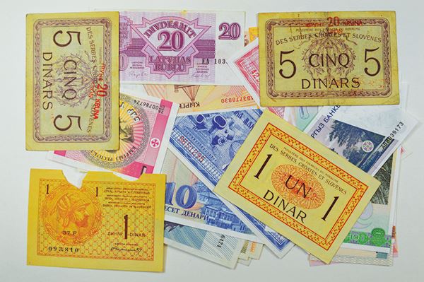 Includes issues from: Kingdom of Serbs, Croates and Slovenians, Kyrgyzstan, Latvia, Lithuania, Macedonia, Poland, and Russia. Early ones (4) are Fine and slightly damaged. Modern era notes are mostly EF or better. 41 pieces