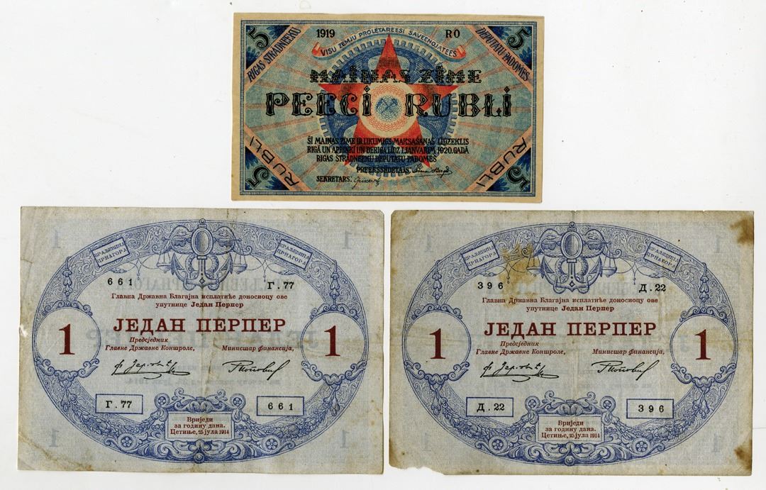 Montenegro..., 1914-19. Lot of 3 Issued Banknotes, Includes: Royal Government of Montenegro 1 Perper, P-15 (2), Blue with dark brown text, Ornamental anchor at top; Riga's Workers Deputies' Soviet - Latvia 5 Rubli, P-R3, 1919. Notes range from Fine-XF condition. (3). Sold "AS IS" no returns accepted.