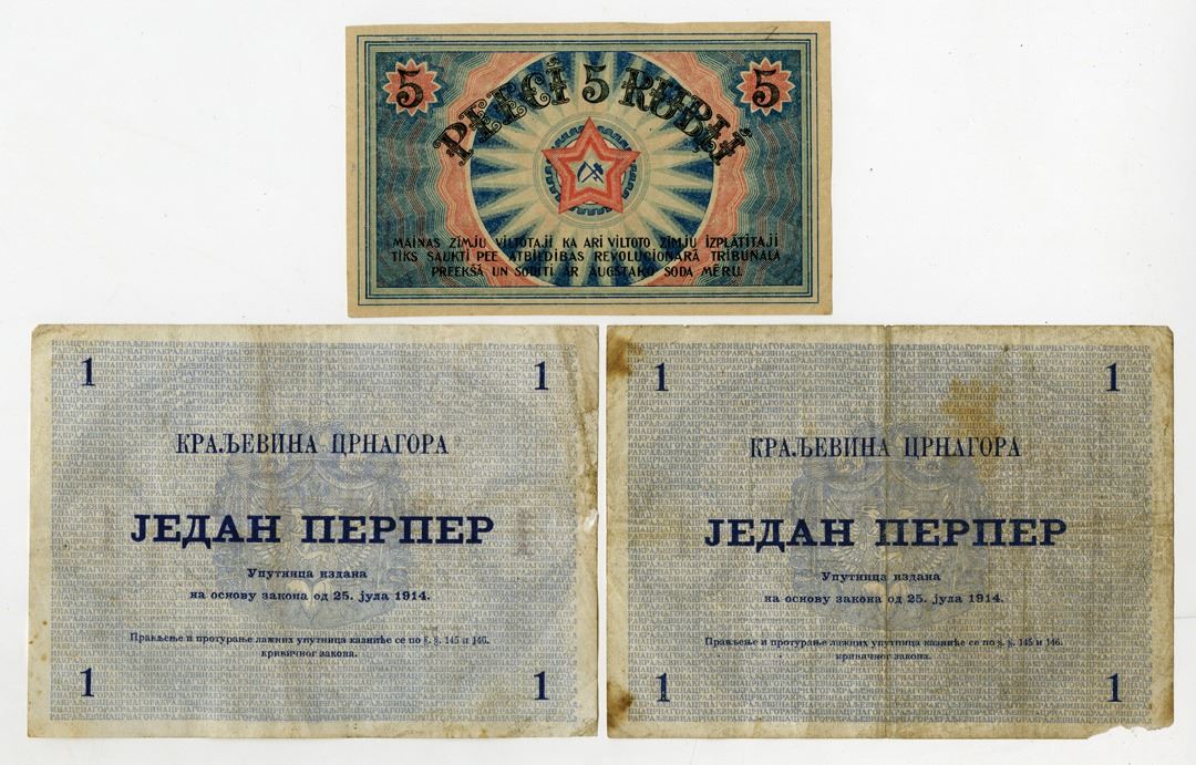 Montenegro..., 1914-19. Lot of 3 Issued Banknotes, Includes: Royal Government of Montenegro 1 Perper, P-15 (2), Blue with dark brown text, Ornamental anchor at top; Riga's Workers Deputies' Soviet - Latvia 5 Rubli, P-R3, 1919. Notes range from Fine-XF condition. (3). Sold "AS IS" no returns accepted.