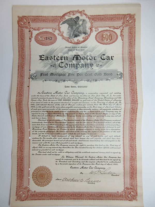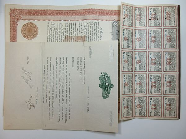 New York. $500 issued and Cancelled 5% First Mortgage Gold Coupon Bond, Black print on brown border and under tint, Bald Eagle at top with company title below, Punched out cancelled along side, VF-XF condition, Broun-Green Co. letter included from Long Wagon Co. dated 1913 regarding value for 10 $500 bonds.