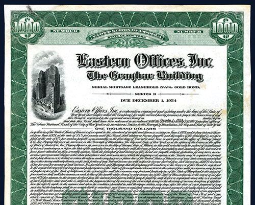 New York, 1928, $1000, Serial Mortgage Leasehold 5 1/4% Gold Bond, Specimen Bond, the Graybar Building is located at 420 Lexington Ave., NYC adjacent to Grand Central Station, VF-XF condition, Security BNC.