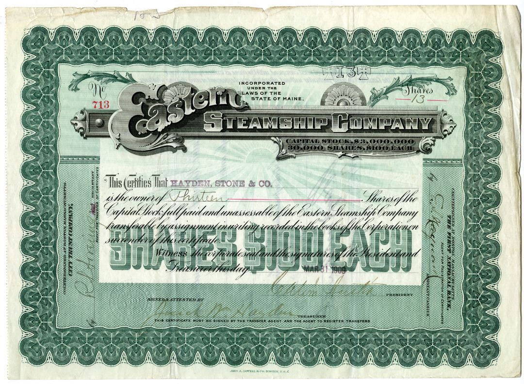 Maine….., 1909. 13 Shares I/U Capital Stock Certificate, Black print with green border and undertint. Fine-VF condition with slight tearing along top edge, John A. Lowell & Co.