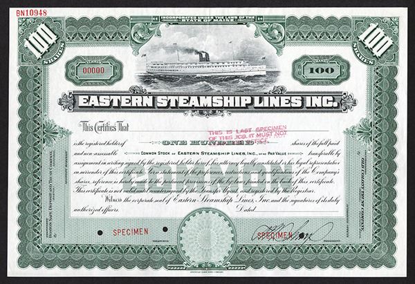 Maine. 100 Shrs Stock Certificate. Nice passenger ship vignette. Specimen. POC, Red SPECIMEN overprint. ABNC. Extremely Fine.