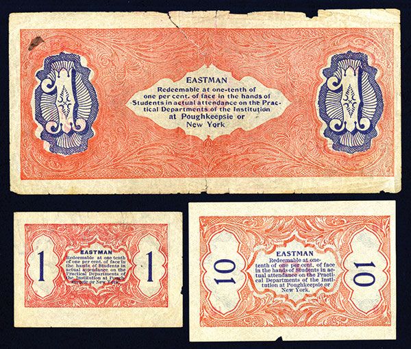 Poughkeepsie, NY, Lot of 3 notes, Includes 1 cents, 10 cents and $1, all are Blue with red underprints, back blue and red, Choice Fine to VF, the $1 with small faults and a 1 inch tear in the top middle margin. Scarcer Eastman varieties.