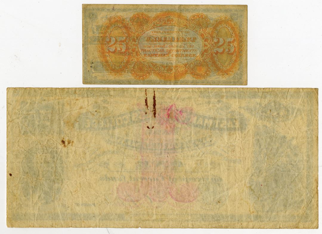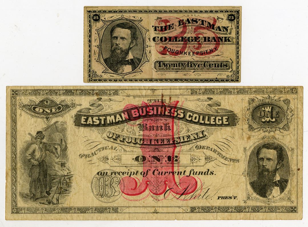 Poughkeepsie, New York, 1860-70s. Lot of 2 notes, Includes: Eastman Business College Bank of Poughkeepsie, N.Y., $1 Issued Banknote, Black text with red "1" underprint, Blacksmith depicted at left, Portrait of Harvey G. Eastman at right, Choice Fine to VF with paper clip rust at top middle; and Eastman College Bank, 25 Cents Issued Fractional Banknote, Black text with "25" underprint, Eastman portrait at left, Choice VF condition. (2)