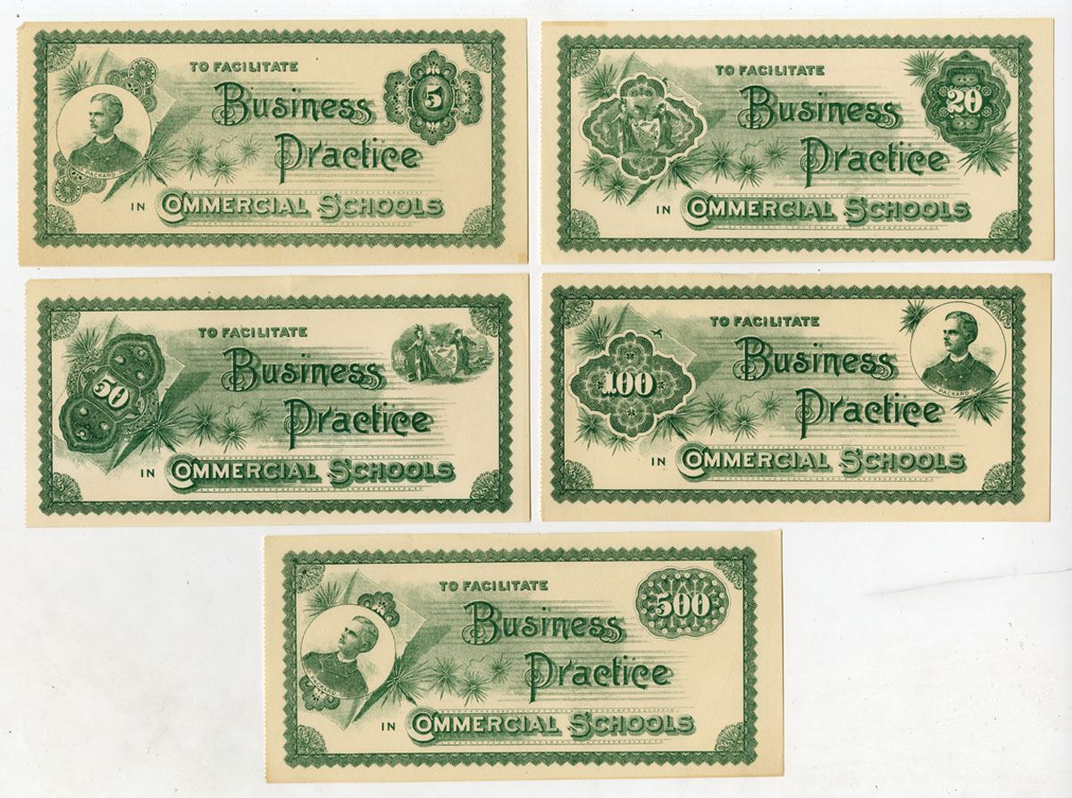 New York, 1860s. Lot of 5 Obsolete Scrip Notes, Includes: $5, $20, $50, $100, & $500 Scrip Notes, all are Uniface with Green printing and "To Facilitate Business Practice in Commercial Schools" at center of each note, VF to XF condition. (5). Sold "AS IS" no returns accepted.