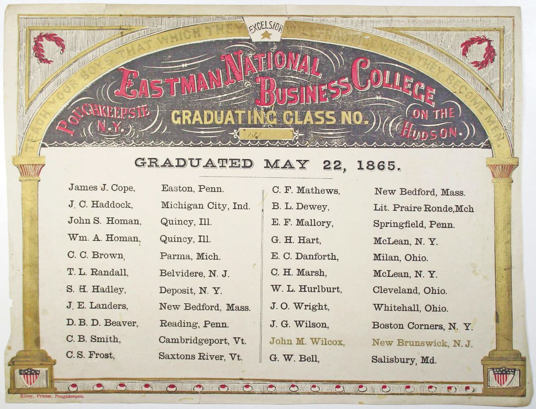 Poughkeepsie, New York, 1865. 12.75 x 10 inch colorized list of men who belonged to the 131st Graduating Class from the Eastman National Business College, located in Poughkeepsie, New York. Lists the men as well as their hometowns, with John M. Wilcox from New Brunswick, N.J. highlighted in gold ink, as this piece may have been issued to him. Black text with ornate header, with "Teach your boys that which they will practice when they become men" surrounding with "Excelsior" with start at top center. Fine condition with slight rip at top and bottom. The Eastman Business College was founded in 1859 by Harvey G. Eastman, and was for a time one of the largest commercial schools in the United States. Rather than merely being a theoretical school, students gained practical experience in the business arts by actually performing the tasks that would be expected of them in their working careers, a novel approach at the time. VF condition with a few small archivally reinforced tears that are difficult to see. Rare and early College Business School related ephemera.