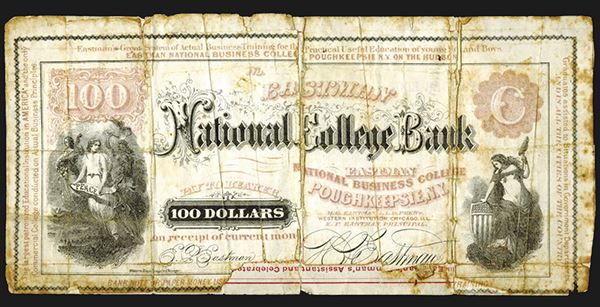NY. Eastman National Business College Bank $100 note facsimile used in an ad. Separated vertically, now pasted on to another printed sheet.